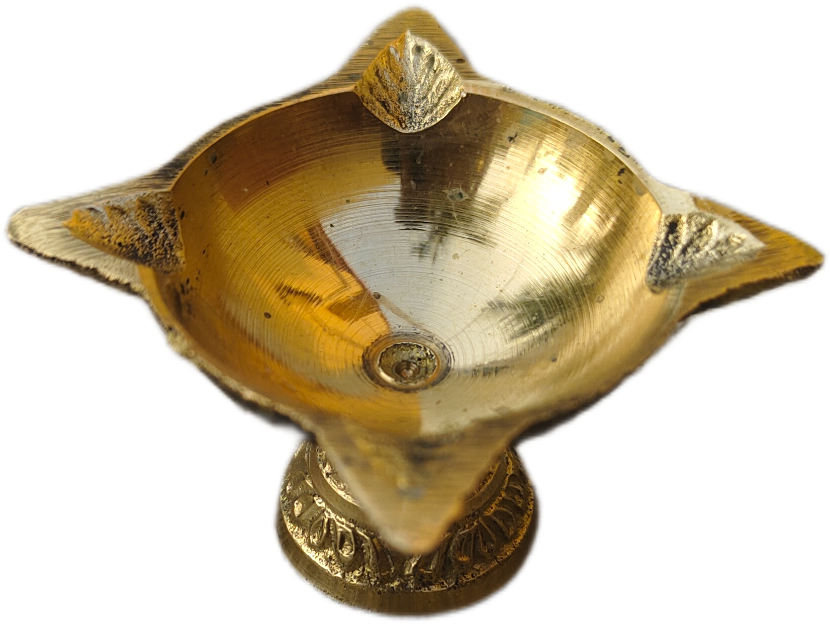 Supporting the diya is a sturdy pedestal base, designed to elevate the lamp while ensuring stability on flat surfaces. The base features engraved detailing that enhances the overall appearance without overpowering the design. Its weighted construction minimizes the risk of tipping, even when the diya is filled with oil and lit. This makes it suitable for placement on tables, shelves, platforms, entry areas, or floor-level arrangements.
